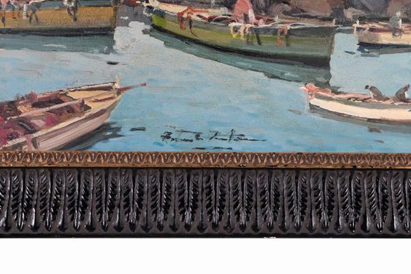 Firmato. "Porticciolo di pescatori sulla costa calabra", dipinto ad olio su compensato