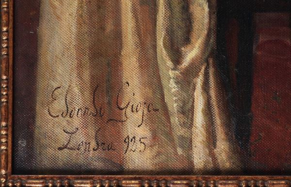 Firmato ed iscritto Londra 1925. "Ritratto di nobildonna in salotto", dipinto ad olio su tela
