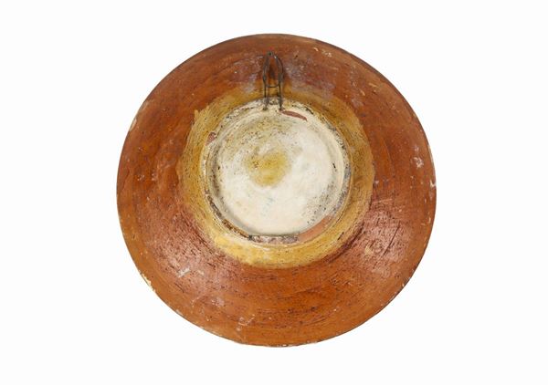 Grande piatto da parata in maiolica smaltata, con decorazioni floreali in blu e stemma nobiliare al centro