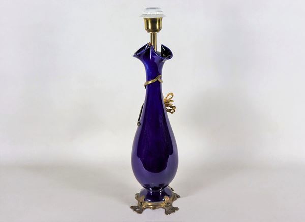 Lampada francese Liberty in porcellana blu cobalto con applicazioni in bronzo dorato
