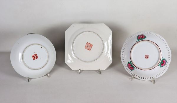 Lotto cinese di due ciotole e un piatto ottagonale in porcellana, con smalti policromi a rilievo a motivi di fiori orientali (3 pz)