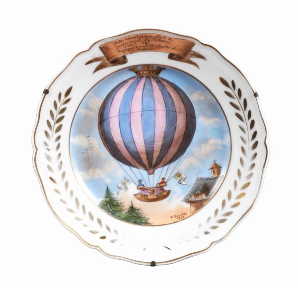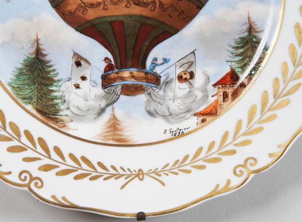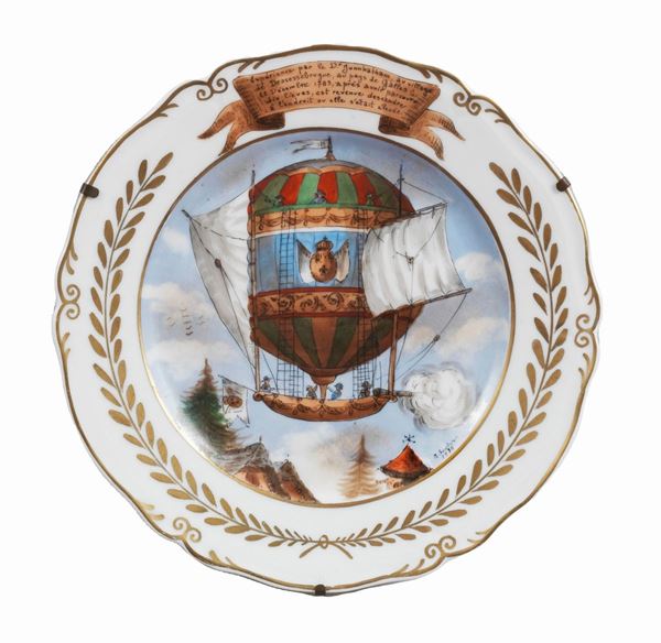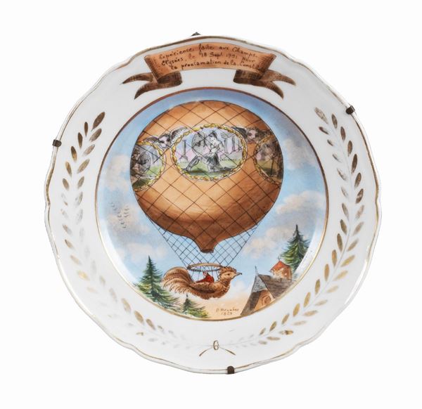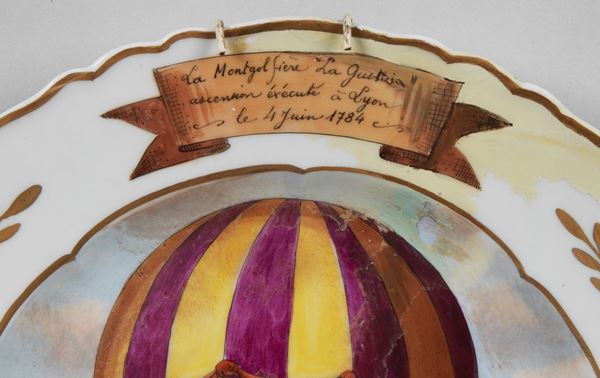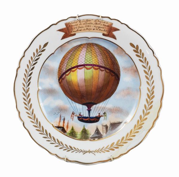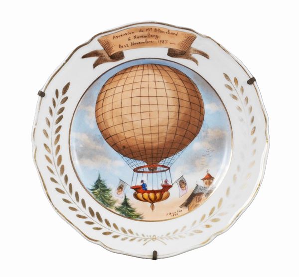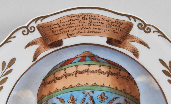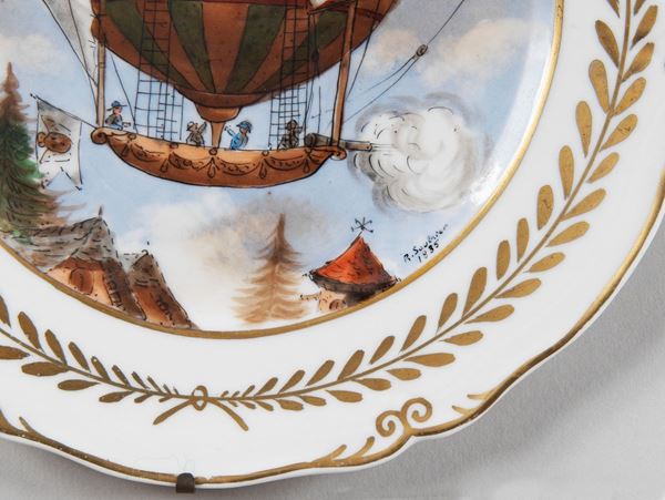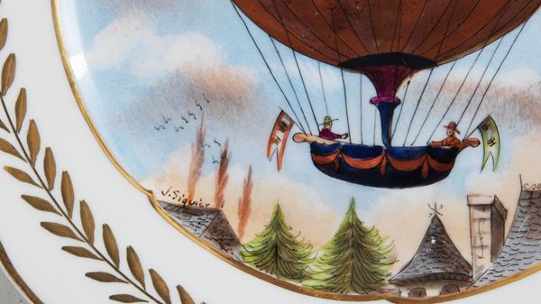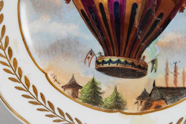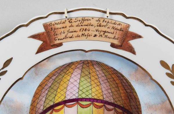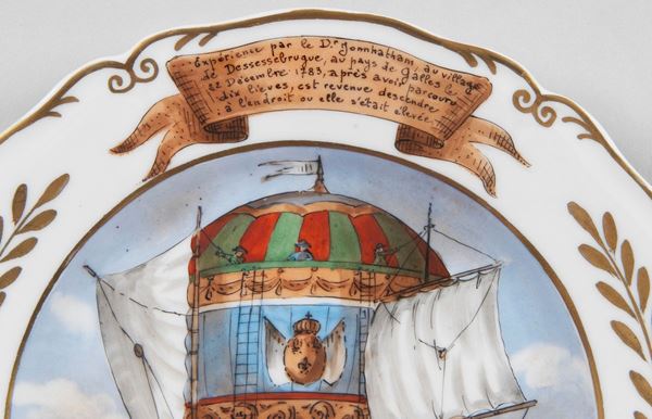 Lotto di dodici antichi piatti ornamentali francesi in porcellana di Sinceny, dipinti con ricorrenze di varie ascensioni di mongolfiere avvenute [..]