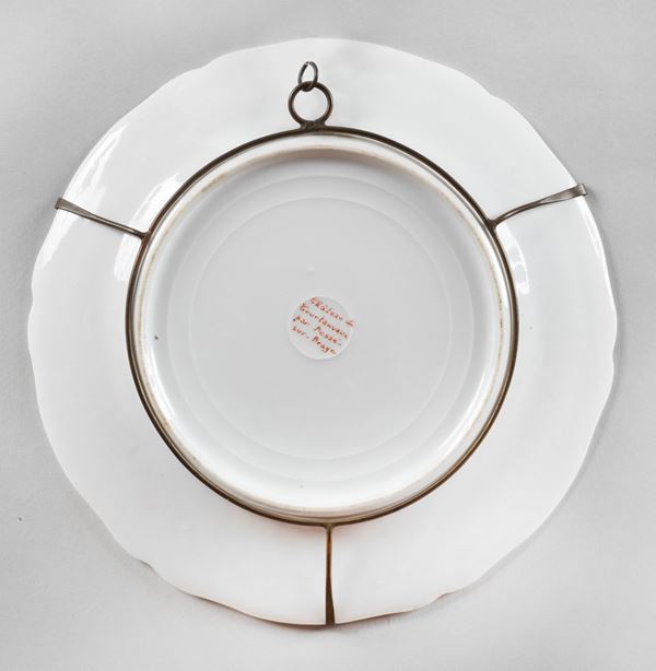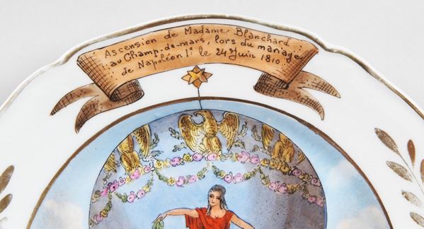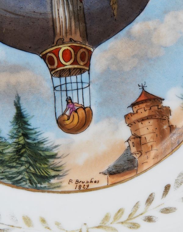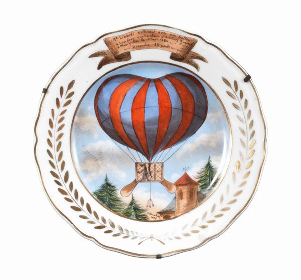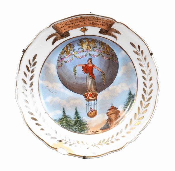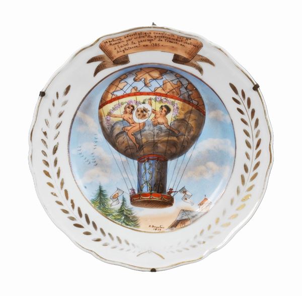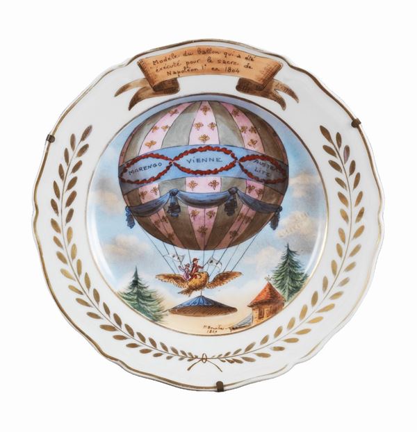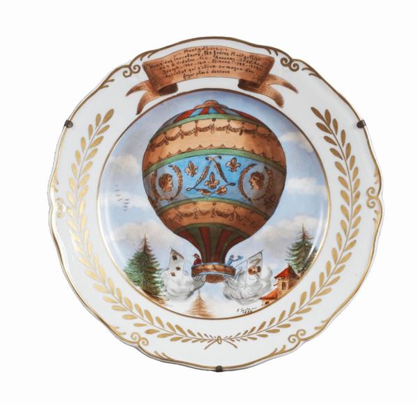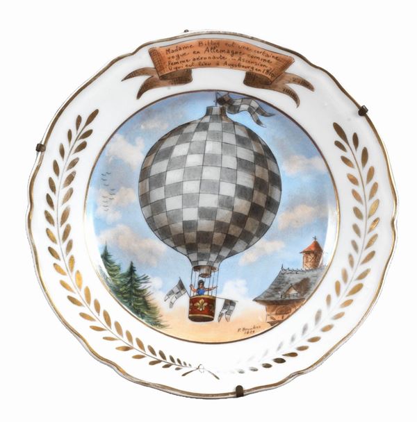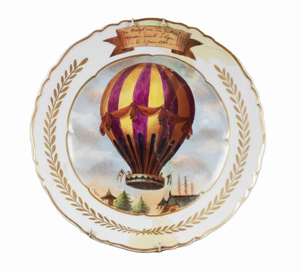 Lotto di dodici antichi piatti ornamentali francesi in porcellana di Sinceny, dipinti con ricorrenze di varie ascensioni di mongolfiere avvenute [..]