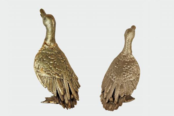 Lotto di due papere in bronzo dorato, una grande e una piccola