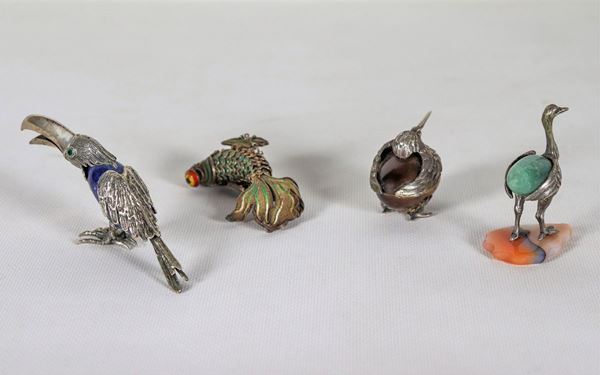 Lotto di quattro animaletti in argento e pietre dure "Pesce e uccelli esotici"