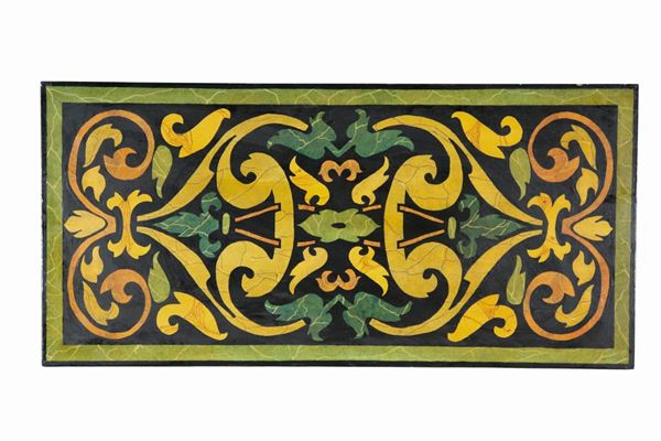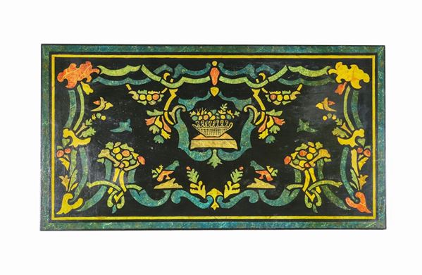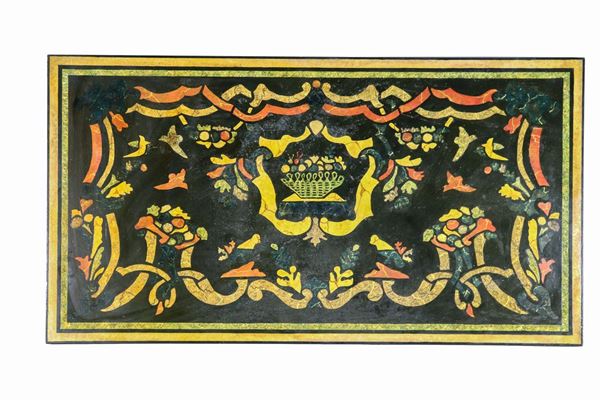 Lotto di tre pannelli rettangolari in legno laccato nero e dipinti a finto marmo a motivi di volute, fiori e vasi
