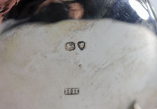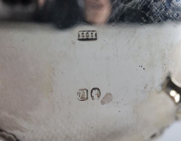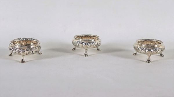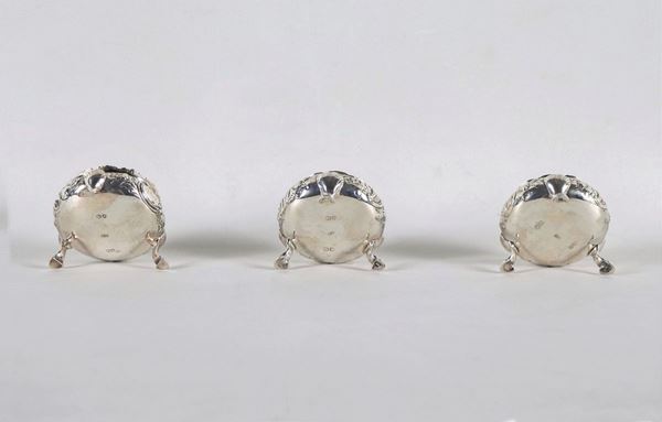 Lotto di tre saliere in argento cesellato e sbalzato, Epoca Regina Vittoria, sorrette da tre piedini leonini, gr. 200