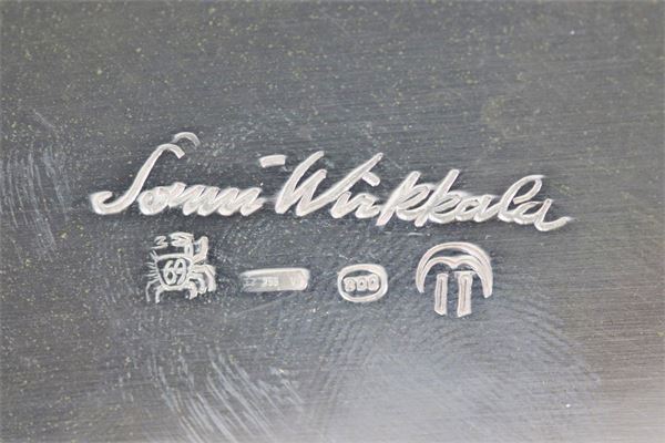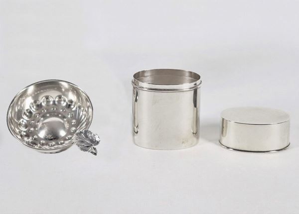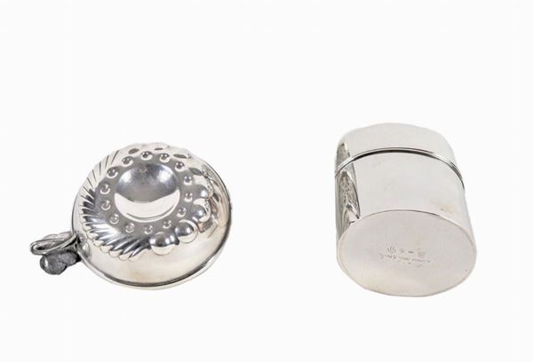 Lotto in argento cesellato e sbalzato di una coppetta assaggiavino e una scatola ovale portasigarette, (2 pz) gr. 210