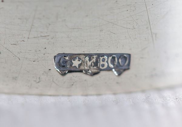 Lotto in argento cesellato e sbalzato di una vaschetta ovale con piedini e quattro portatovaglioli, (5 pz) gr. 250