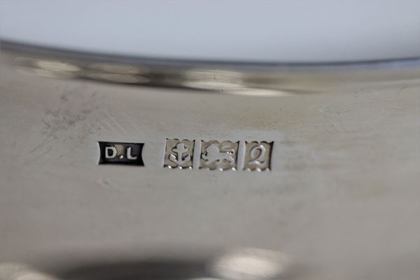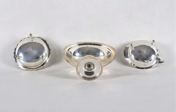 Lotto in argento inglese di una cremiera, una saliera tonda e un portasalse "a barchetta", (3 pz) gr. 290