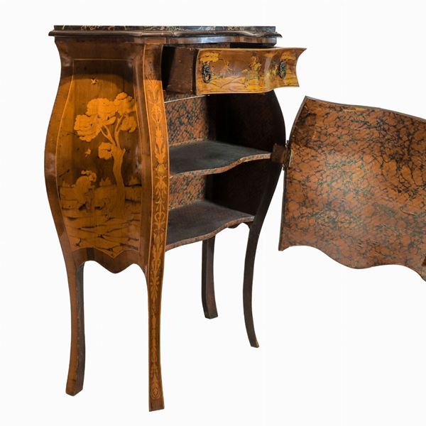 Mobile lombardo-veneto a forma bombata centinata in noce, interamente intarsiato in bosso a motivi di paesaggi e scene di caccia