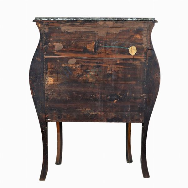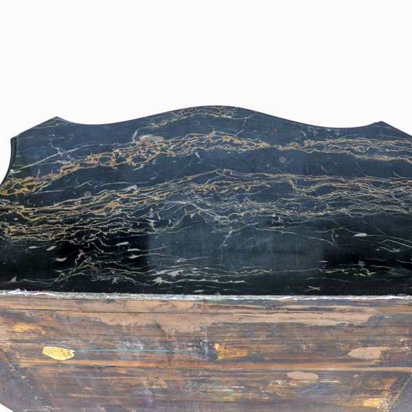 un tiretto centrale con sportello sottostante, quattro gambe alte ricurve e piano in marmo nero brecciato, cm 95 x 39 x 121 h.