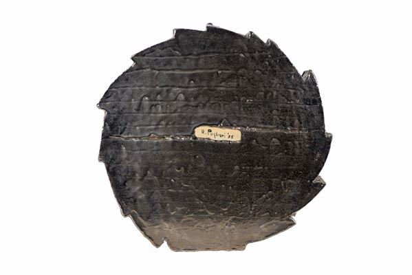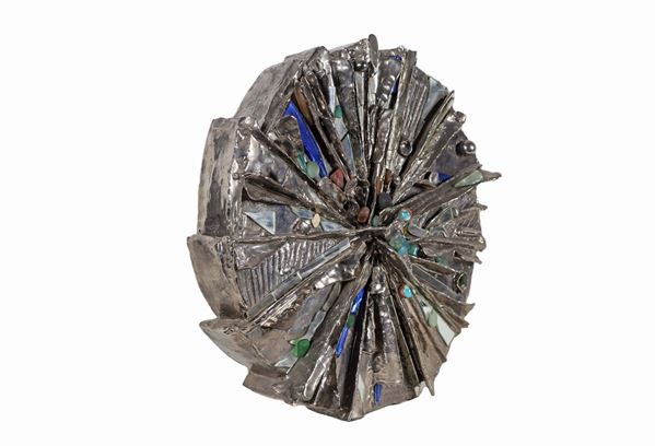 Firmata e datata 1975. "Ruota", scultura astratta in ceramica corrugata e argentata con frammenti in vetro, biglie e sassi colorati