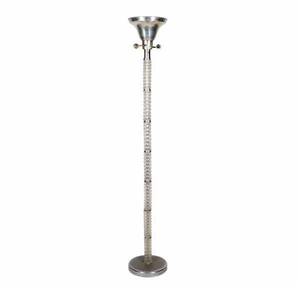Piantana da terra in cristallo e vetro di Murano lavorato a bolle con base tonda in metallo argentato, 3 luci