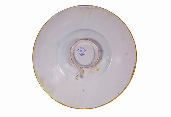 Piatto da parata in maiolica lustrata Gualdo Tadino a varie policromie, al centro "Costanza"
