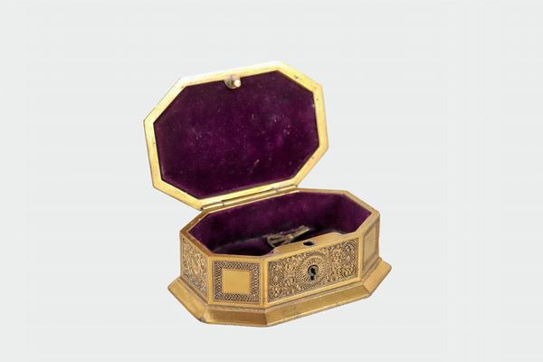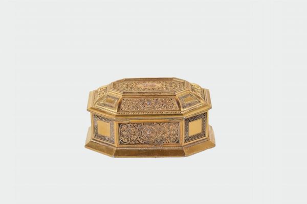 Piccola scatola ottagonale portagioie in metallo dorato, sbalzato e cesellato a motivi di intrecci floreali e rosoni