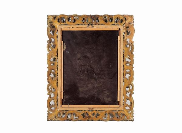 Piccola specchiera in legno dorato, intagliato e traforato a volute di foglie d'acanto