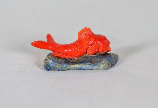 Piccola statuina in corallo rosso "Pesce esotico" con basetta in pietra dura di lapislazzulo