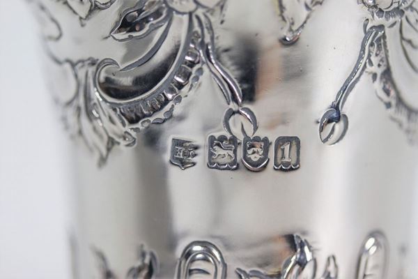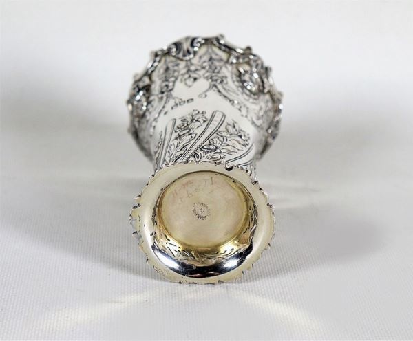 Piccolo vaso portafiore in argento Epoca Edoardo VII, cesellato e sbalzato a rilievo a motivi di ghirlande floreali e volti di cinesini, gr. [..]