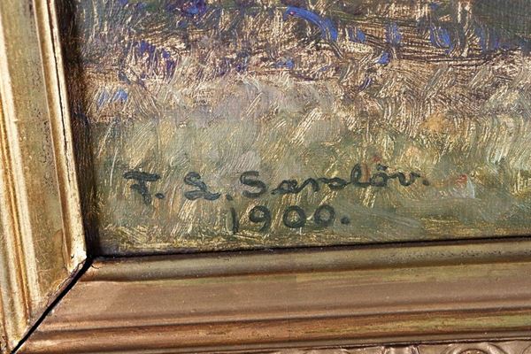 Firmato e datato 1900. "Paesaggio di campagna con case e alberi", dipinto ad olio su tela