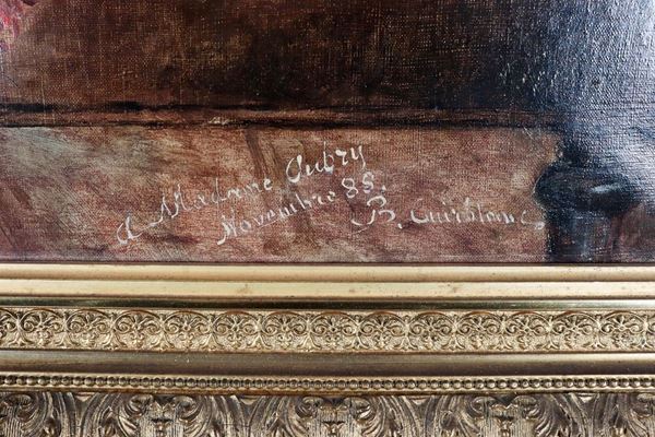 Firmato con dedica e datato 1888. "Natura morta di fiori e vasellame", luminoso dipinto ad olio su tela