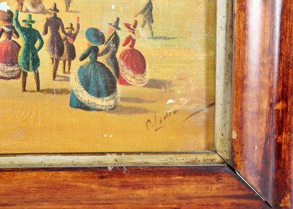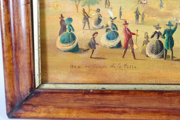 Firmato. 'Ascensione della mongolfiera con personaggi festanti', dipinto ad olio su tavola