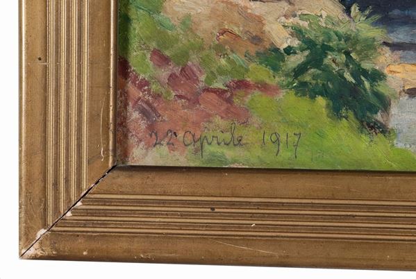 Firmato e datato 1917. "Paesaggio con ponticello e corso d'acqua", piccolo dipinto ad olio su cartone pressato