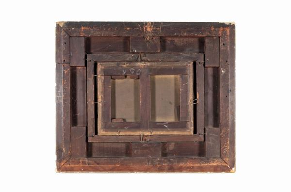 antica cornice in legno dorato ed intagliato, che presenta vari difetti, cm 22 x 28.