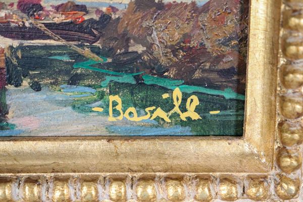 Firmato. "Veduta della Costiera Amalfitana con barche e pescatori", piccolo dipinto ad olio su cartone pressato
