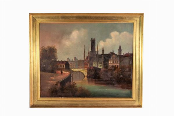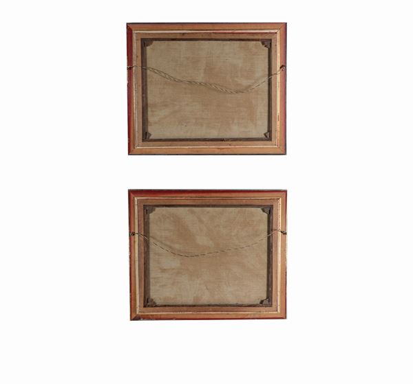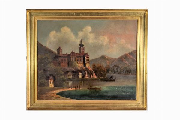 "Vedute di castello con lago e di città con fiume", coppia di dipinti ad olio su tela applicata a cartone