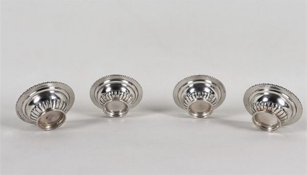 Quattro saliere tonde in argento Sterling 925 a forma di anforette, all'interno vaschette in cristallo, gr. 360