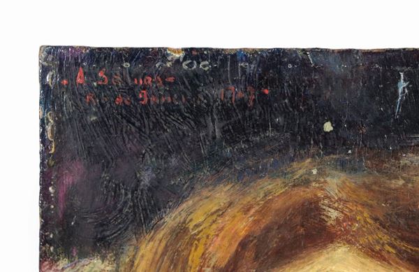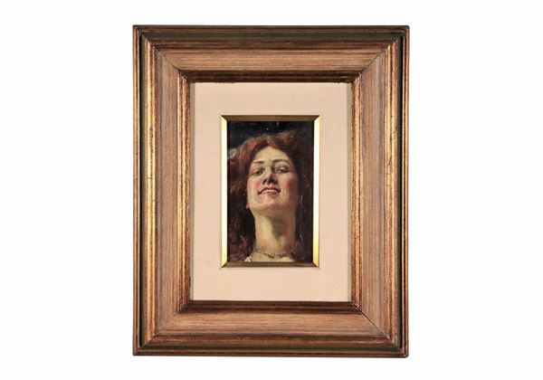 Firmato, iscritto e datato Rio de Janeiro 1907. "Ritratto di ragazza con collana", piccolo dipinto ad olio su tavoletta