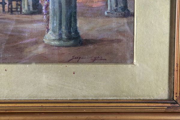 Firmato. "Veduta di interno di villa con veduta della Costiera Amalfitana", piccolo dipinto ad olio su tela