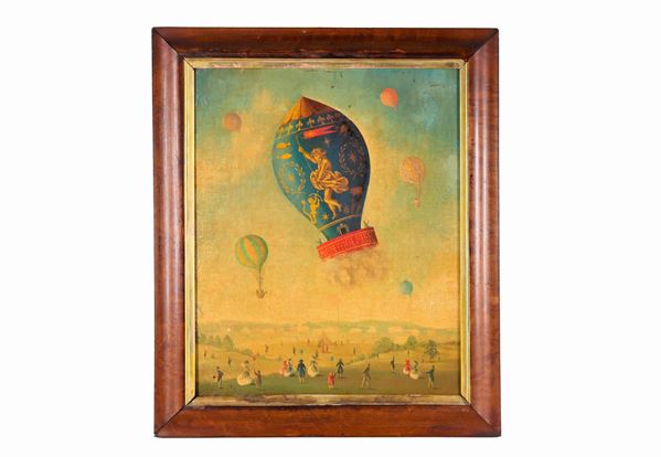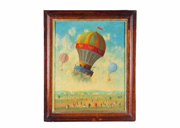 'Ascensioni delle mongolfiere con personaggi', lotto di due dipinti ad olio su tela