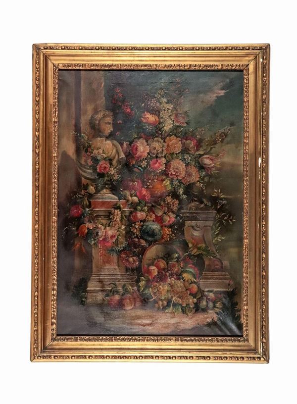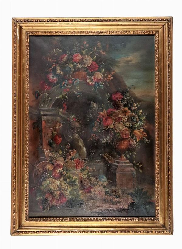 "Nature morte con vasi di fiori e frutta", coppia di dipinti ad olio su tela