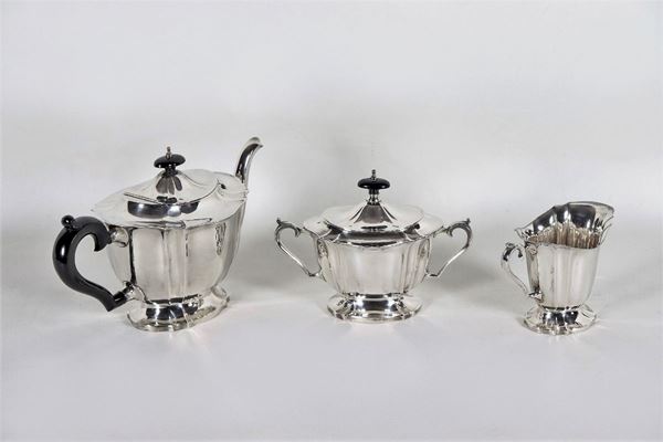 un manico e due pomi in legno ebanizzato, composto da: teiera, lattiera e zuccheriera. Altezza massima cm 18.