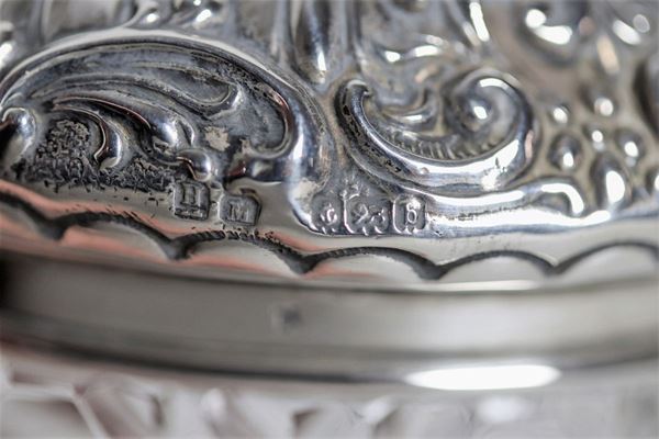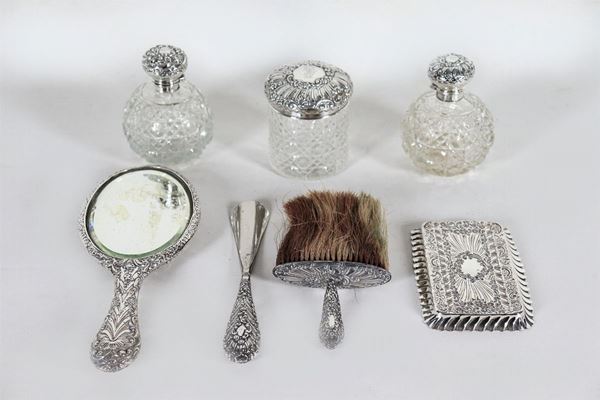 Servizio da toletta Edoardo VII in argento e cristallo, cesellato e sbalzato ad intrecci floreali e baccellature (7pz)