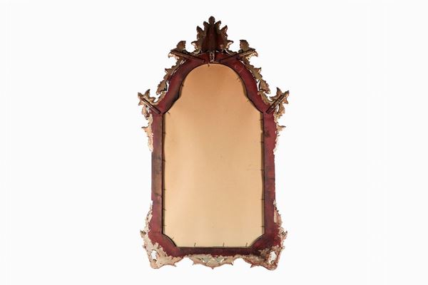 Specchiera di linea Luigi XV in legno dorato e argentato, con intagli a motivi di volute floreali, fiori e conchiglia