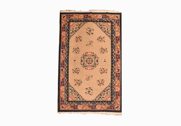 Tappeto cinese a motivi geometrici su fondo avana e bordi blu, m 2,45 x 1,50