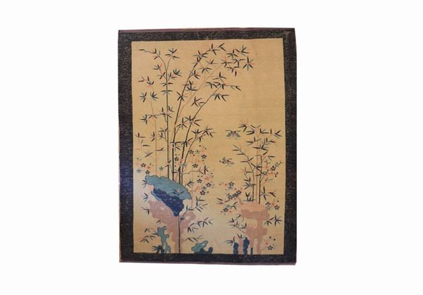 Tappeto cinese con bordo blu e rami fiorati, lievi rapè e varie macchie, m 2,63 x 1,82