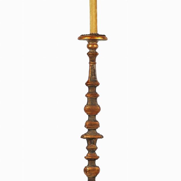 Torciere da terra in legno dorato e argentato con intagli a motivi Luigi XIV