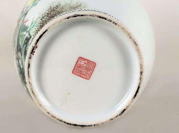 Vaso in porcellana cinese, con decorazioni policrome in smalti a rilievo a motivi di uccelli esotici e fiori