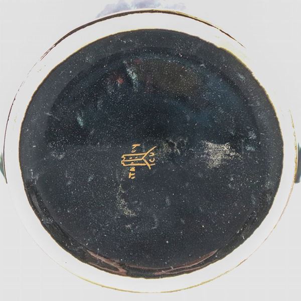 Vaso Liberty in ceramica smaltata in blu con colatine in verde, base e bordo del collo in oro zecchino