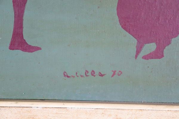 Firmato e datato 1970. "Il Concertino" olio su compensato cm 28,5 x 49