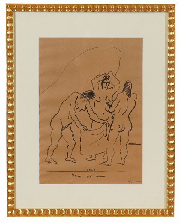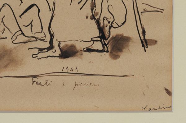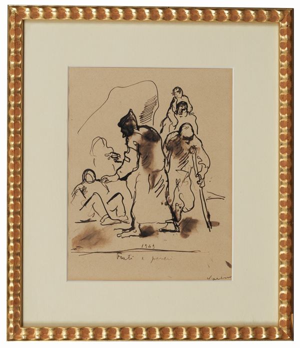 Firmati e datati 1949. "Donne sul mare" e "Frati e poveri" due disegni ad acquarello e china cm 33 x 23,5 e cm 26 x 20