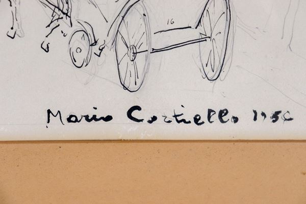 Firmato e datato 1956. "Passeggiata in carrozzella" disegno a china e matita su carta cm 35 x 45