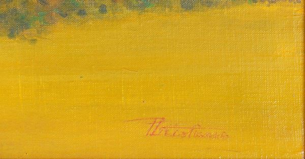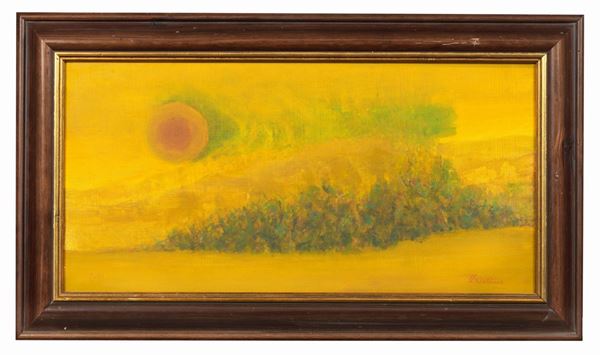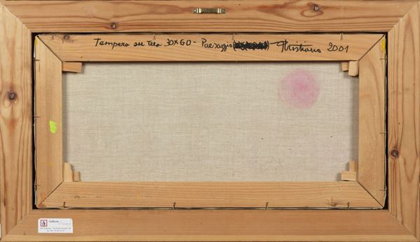 Firmato e datato 2001. "Paesaggio" tempera su tela cm 30 x 60