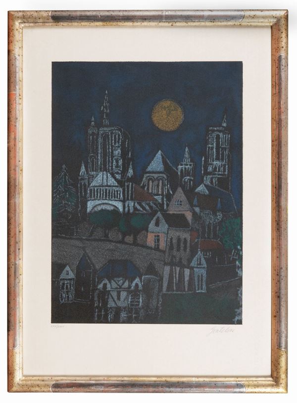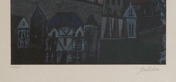 Firmata. "Veduta di città" litografia a colori multiplo LXIV/LXXV cm 74 x 54
