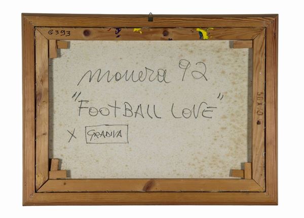 Firmato e datato 1992 sul retro della tela. "Foot BALL LOVE" tecnica mista, smalto e collage su tela cm 50 x 70