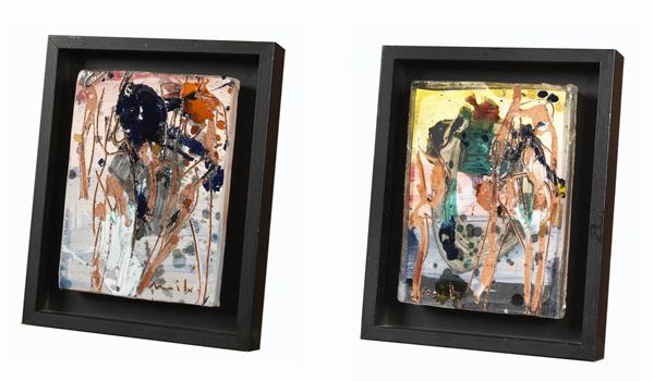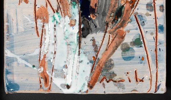 Firmate. "Sto ancora studiando" e "Struttura complicata" coppia di mattonelle in ceramica dipinte ad olio e smalto cm 24 x 18 ciascuna
